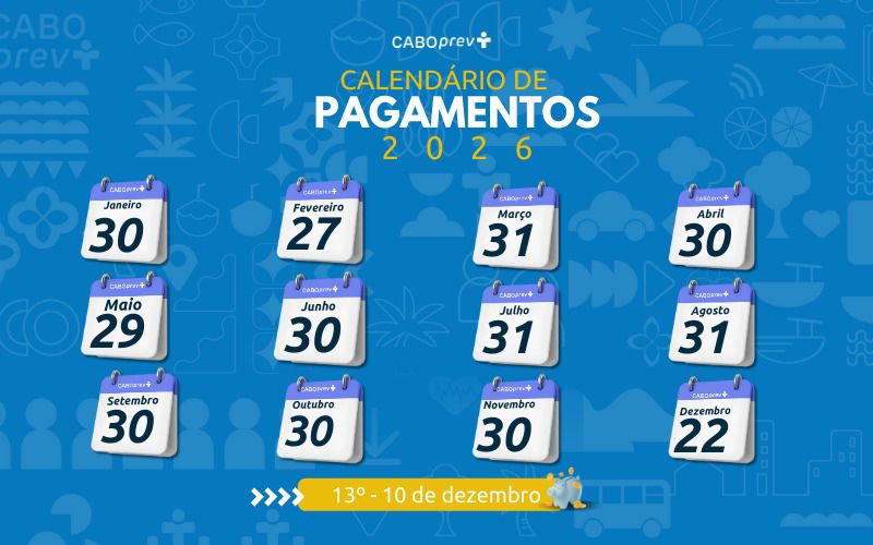 📅 Saiu o calendário de pagamentos do Caboprev 2026! Aposentados e pensionistas, já podem se organizar 💙 As datas de pagamento ao longo do ano já estão definidas, incluindo o 13º salário, que será pago no dia 10 de dezembro. Confira o calendário completo e fique por...