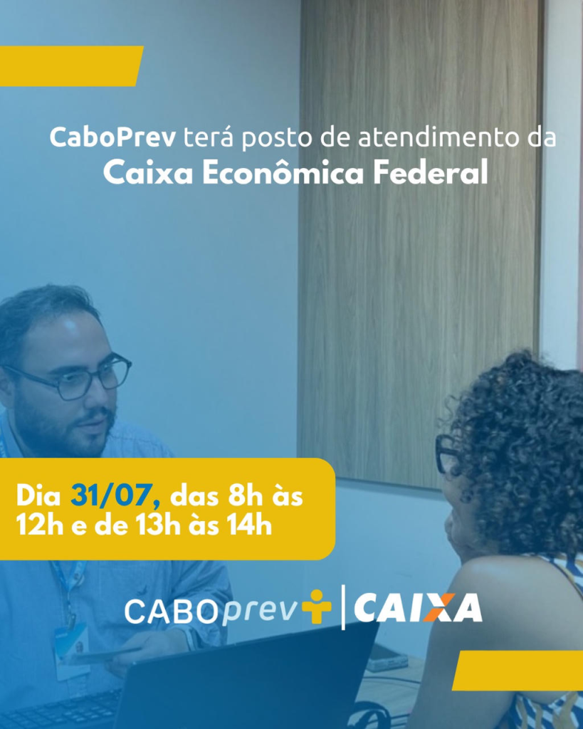 Na quinta feira (31/07) acontecerá mais um atendimento do Posto Caixa Econômica Federal no Caboprev das 08h as 12h e das 13h as 14h realizando serviços da caixa aos aposentados, aposentadas, pensionistas da instituição e servidores ativos da Prefeitura do Cabo de Santo Agostinho.